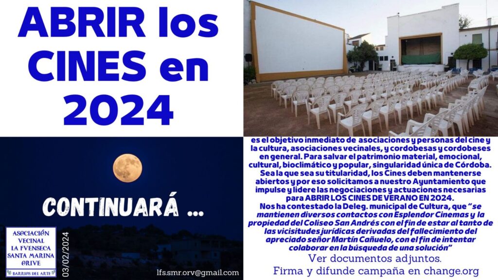 Ese es el objetivo inmediato de asociaciones y personas del cine y la cultura, asociaciones vecinales, y cordobesas y cordobeses en general. Para salvar el patrimonio material, emocional, cultural, bioclimático y popular, singularidad única de Córdoba.