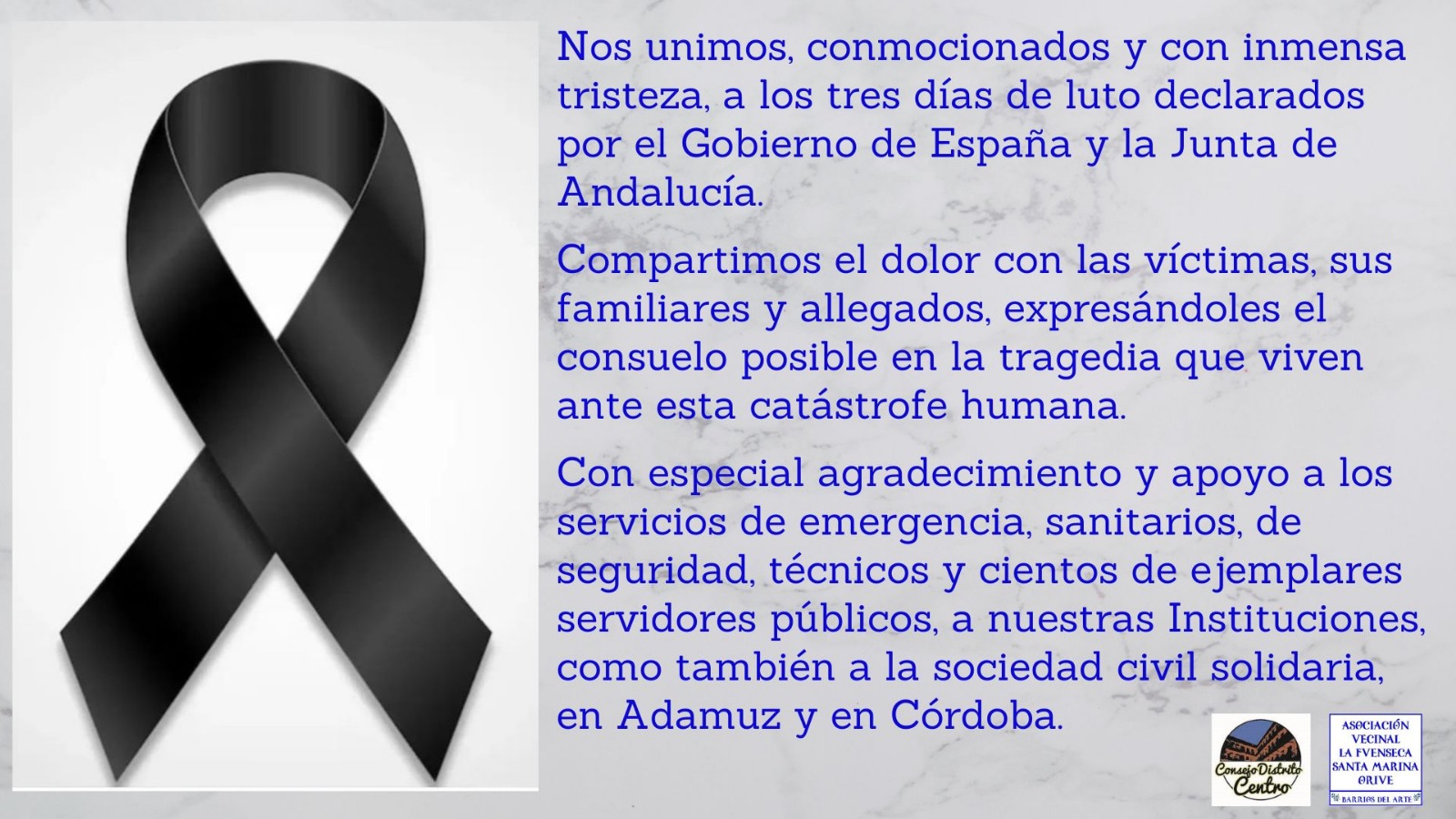 Nos unimos, conmocionados y con inmensa tristeza, a los tres días de luto declarados por el Gobierno de España y la Junta de Andalucía.