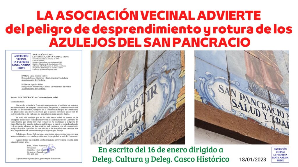 La asociación vecinal advierte del peligro de desprendimiento y rotura de los azulejos del San Pancracio en el Convento Santa Isabel.
